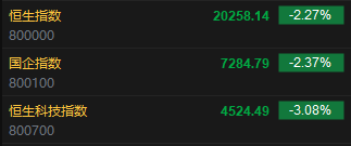 11月11日消息,美股上周五持续升势,市场憧憬特朗普上场后有更多刺激经济政策出台,三大指数表现向好,其中道指及标普500指数均创出历史新高。美元走势向好,美国十年期债息回落至4.30厘水平,金价表现向下,油价走势亦偏软。今日港股三大指数集体低开,恒生指数跌2.27%,报20258.14点,恒生科指跌3.08%,国企指数跌2.37%。盘面上,科网股普跌,京东跌超5%,美团跌超3%,网易、阿里巴巴跌近3%;内房股齐挫,世茂集团跌超9%;中资券商股普遍下跌,中信证券跌超4%;汽车股普跌,理想跌超4%;半导体概念股部分强势,中芯国际高开近5%。