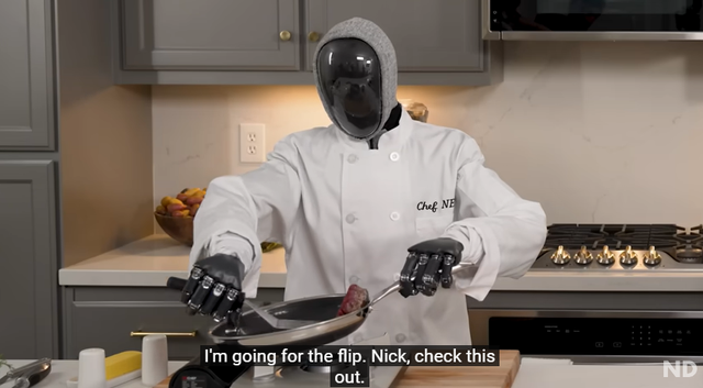 日前该机器人解锁了新场景——厨房,NEO和网红厨师Nick DiGiovanni进行了一场家庭烹饪对决,比赛做出完美的五分熟牛排。Nick是MasterChef (《厨艺大师》/《厨神当道》)史上最年轻的决赛选手,MasterChef是美国规格最大、参赛者类型和数量最丰富的烹饪实境秀。在YouTube频道,Nick目前有2120万粉丝。
