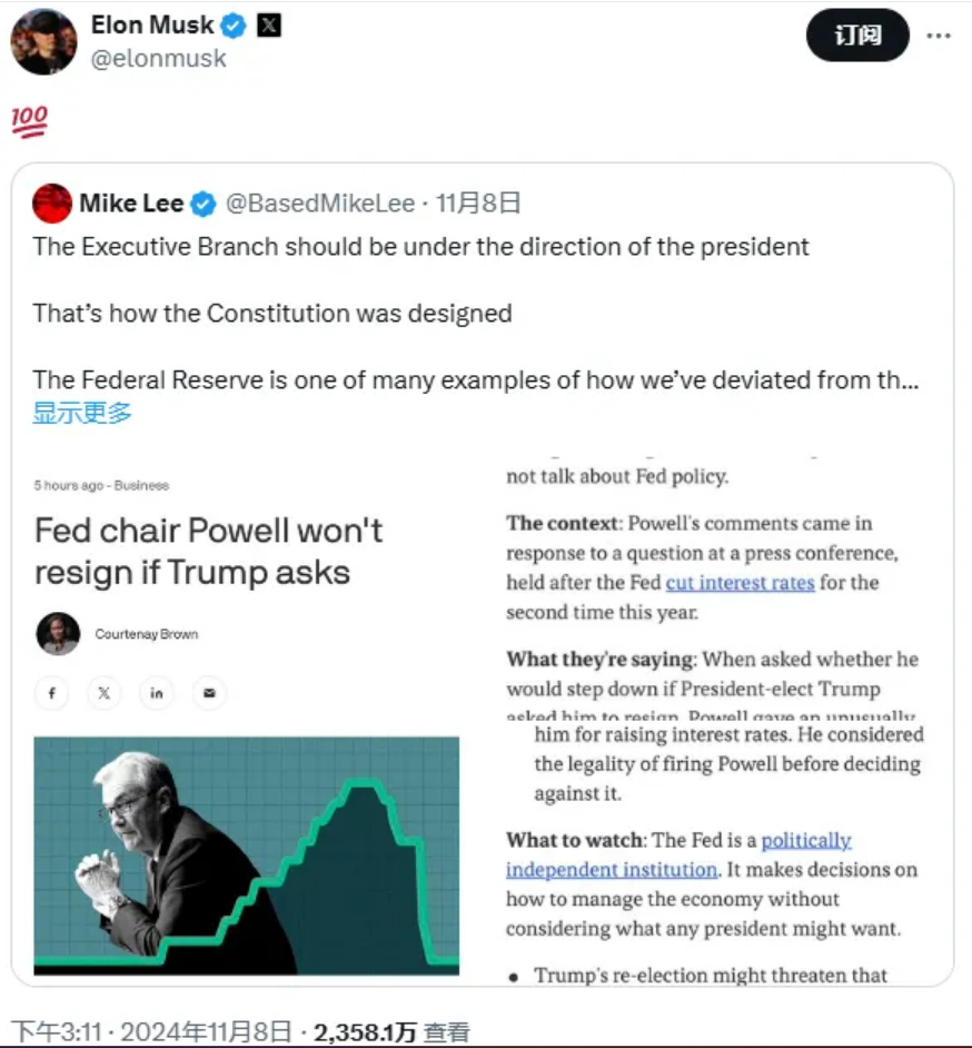 马斯克的评论虽简短,却反映了可能在下届特朗普政府中形成的对美联储独立性的更广泛施压运动。